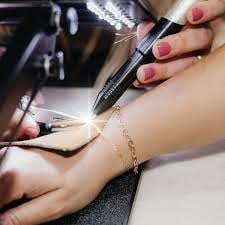 No way! Welding permanent jewelry is quick and painless. One quick, small spark melts the metal and bonds the jewelry to itself.